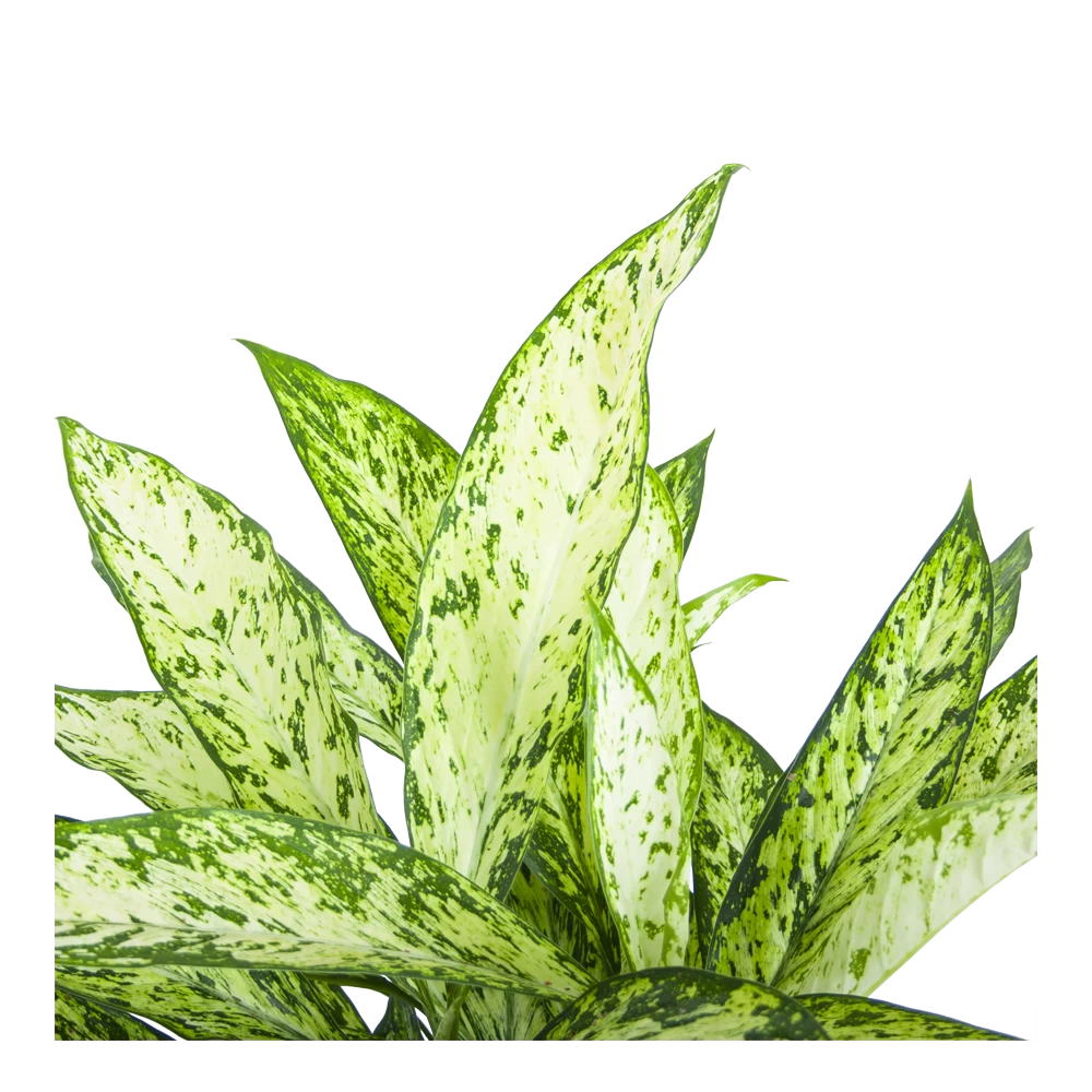 De grote bladeren van de Dieffenbachia Vesuvius hebben een opvallend motief. De bladtekening van deze groene kamerplant is geelgroen en vlekkerig en steekt goed af tegen het donkergroene blad. Het is een stoere plant die zeker de aandacht trekt. Daarnaast is de Dieffenbachia sterk luchtzuiverend en dat is natuurlijk fijn voor bij jou thuis. Maar hij is ook giftig, dus pas op met kinderen en huisdieren. Plaats hem op een lichte plek met indirect zonlicht. Geef hem regelmatig water en houd de grond tussen het water geven door vochtig.