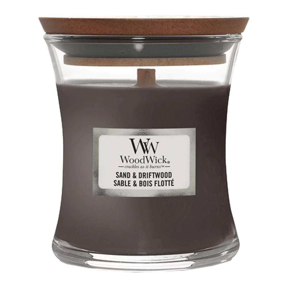 Details van de Woodwick Sand & Driftwood geurkaars: